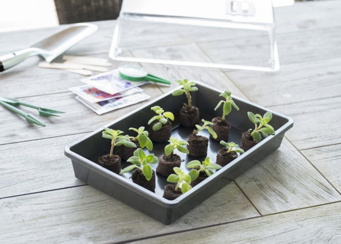 Grow seeds and cutting plants with this propagator by Nature made of durable, injection-moulded recycled rigid polypropylene (PP). The greenhouse has a transparent lid of polystyrene (PS) with two sliding aerators for optimal adjustment of temperature and humidity variations. Colour: green. The mini-greenhouse has a size of H18x37,5x24cm. Easy to clean for reuse.