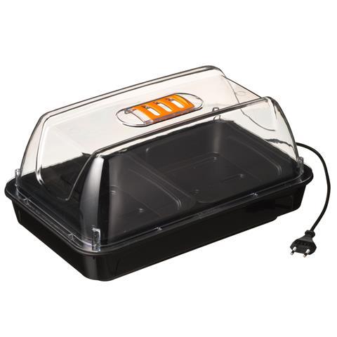 This luxurious, heated Nature propagator has a resistance in its base, ensuring a stable temperature. The propagator is made of durable, injection-moulded polypropylene (PP) and has two separate trays for seedlings made of polypropylene (PP). Thanks to the capillary (moisture retaining) matting, the water is well distributed in the propagator. The transparent lid of polystyrene (PS) is equipped with a sliding central aerator so that the humidity level remains optimal. The propagator has a size of H 19 x 38 x 24 cm.