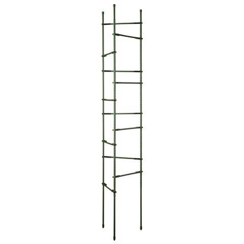 Triangular plant support by Nature made of serrated PE-coated galvanised steel in the colour green. It consists of 3 plant stakes of H150cm, interconnected by 12 cross-arms. Its stable triangular shape is particularly suited for use in the vegetable garden, or in pots where the soil depth is not sufficient to use ar a classic plant stake. The cross-arms are adjustable in height. Diameter 11mm.