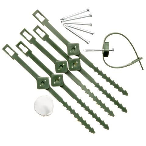 Green plastic “rat tail” type tie by Nature made of polyethylene (PE), to be nailed. It is intended for training climbing plants on hard supports, but furniture (hardwood, rendering, mortar, brick, breeze blocks, etc.). Easy to use, just drive the nail into the wall support with a hammer, then adapt the diameter of the tie to the stems of the climbing plants. The “rat tail” system makes it possible to vary the diameter of the tie as the plant grows. The set consists of 6 ties with nails Ø 25 to 45 mm.