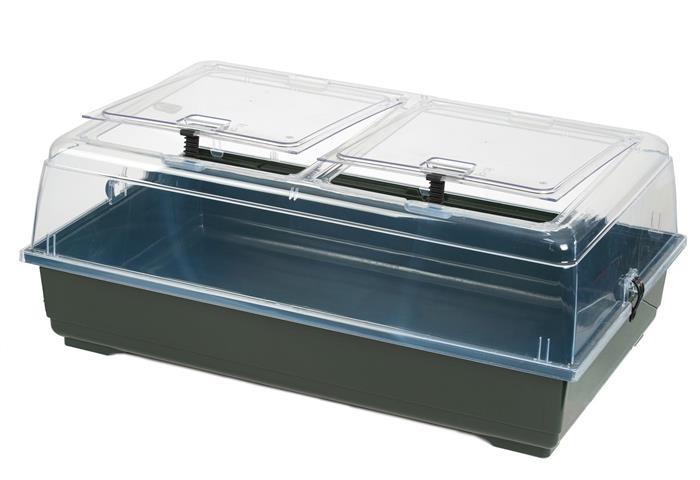 Terrine rigide en plastique injecté, équipée d’un couvercle transparent muni de deux fenêtres réglables en hauteur, permettant un accès aisé et une ventilation optimale du niveau d’humidité.