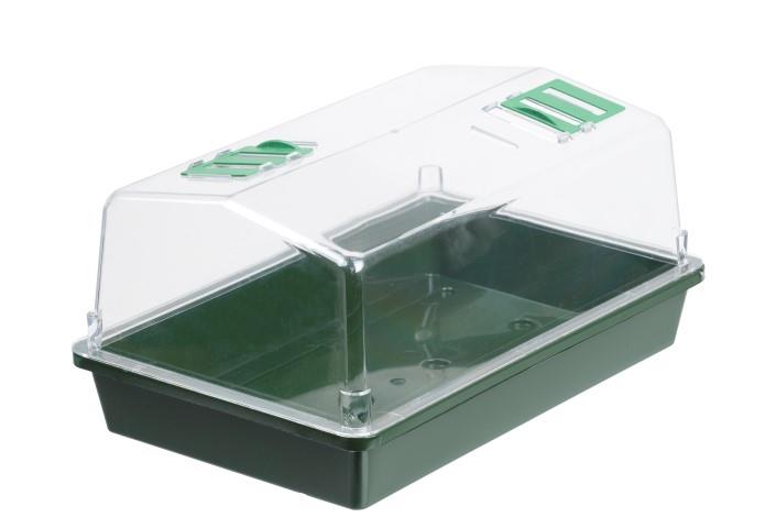 Mini-serre de Nature pour semis et bouturage avec terrine rigide en polypropylène (PP) injecté récyclé, équipée d’un couvercle transparent en polystyrène (PS), muni de deux aérateurs coulissants pour un réglage optimal des variations de température et de l'humidité. Dimension: H18x37,5x24cm. Facile à nettoyer pour réutilisation. Display de 32x art.no. 6020210.