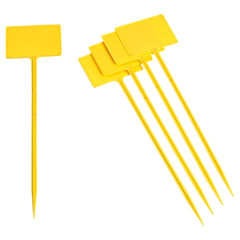 Étiquettes en T de Nature en polypropylène (PP) plastique solide de couleur jaune pour l’identification des plantes dans le jardin. Facile à placer dans le sol. La plaquette d'écriture a une extra grande surface de 5,5x8,5cm. Hauteur 34cm. Emballé par 5 pièces.